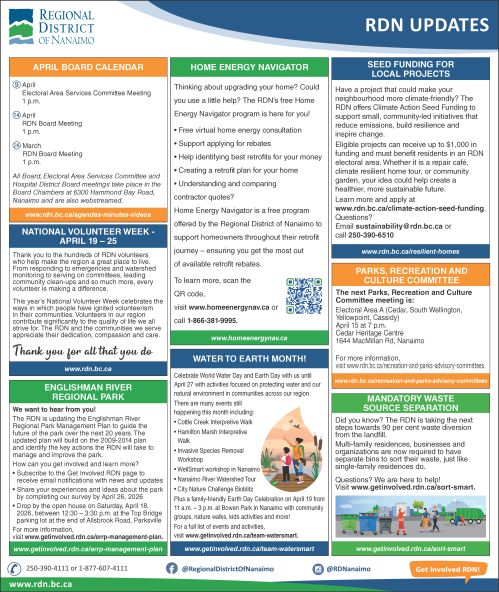 Keep up to date on various projects, initiatives, events and meetings being hosted by the RDN. Be sure to watch for our monthly RDN Updates in the Nanaimo News Bulletin, Gabriola Sounder and Parksville Qualicum Beach News on the first Wednesday of every month. Did you miss them or not get the newspaper? Click below for our recent monthly ads: