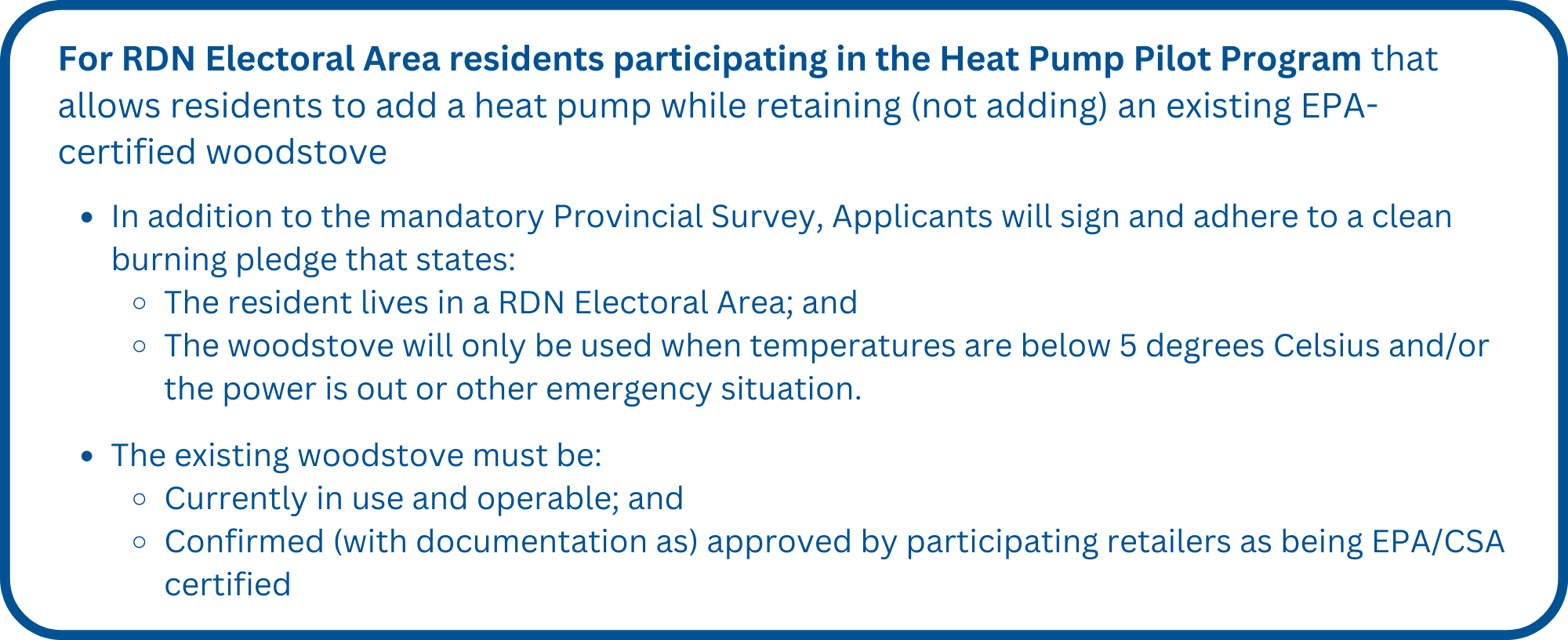 - Electoral Area residents installing a heat pump and keeping their old certified wood stoves must complete the Clean Burning Pledge