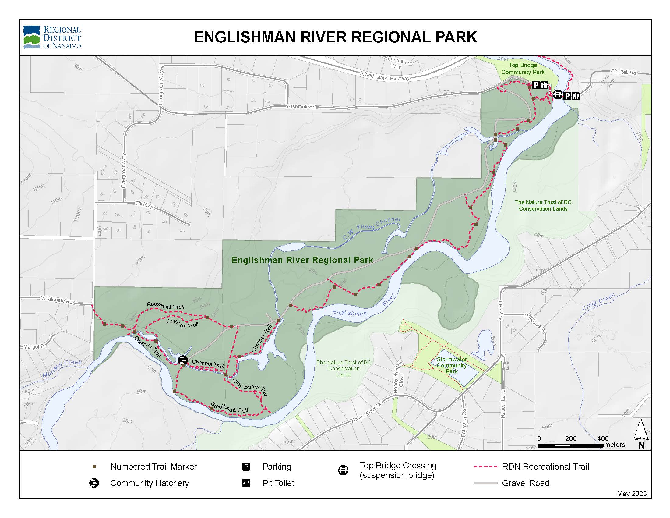 In 2005, the RDN partnered with The Nature Trust of BC, Ducks Unlimited Canada, the Nature Conservancy of Canada and the Province of BC to acquire this 205 hectare property. The river corridor lands represent important salmon habitat, enhanced with 4 km of Department of Fisheries and Oceans Canada side channel and a community hatchery. Home to a wide range of wildlife including elk, bear and cougar, the park offers lots of room for walkers, cyclists and equestrians to roam and feel at one with nature.