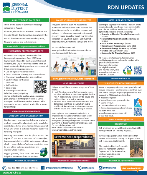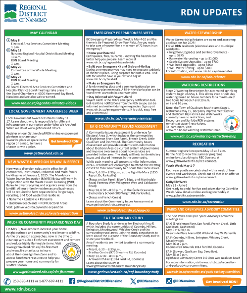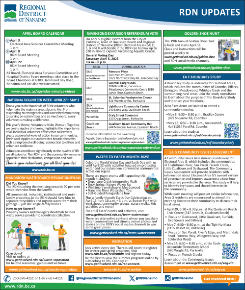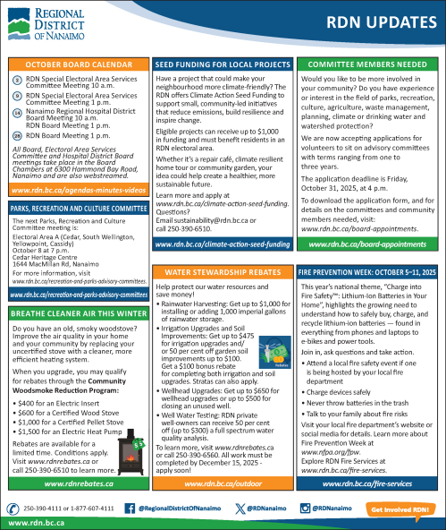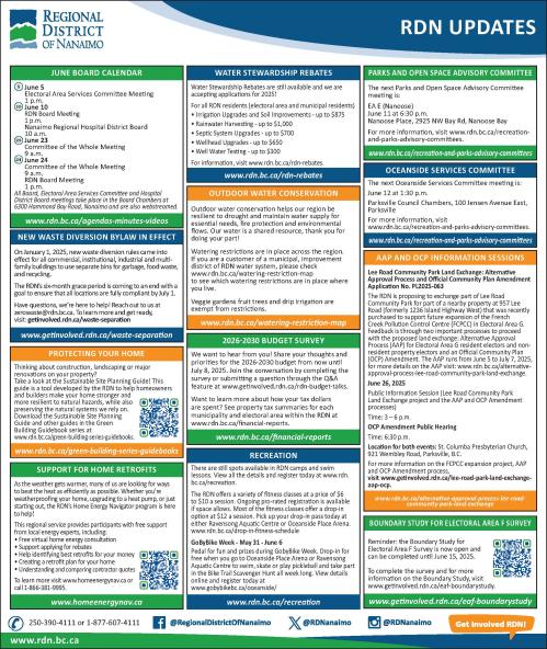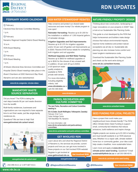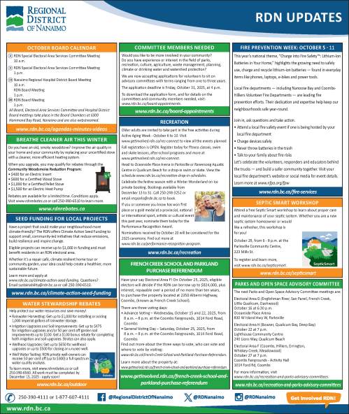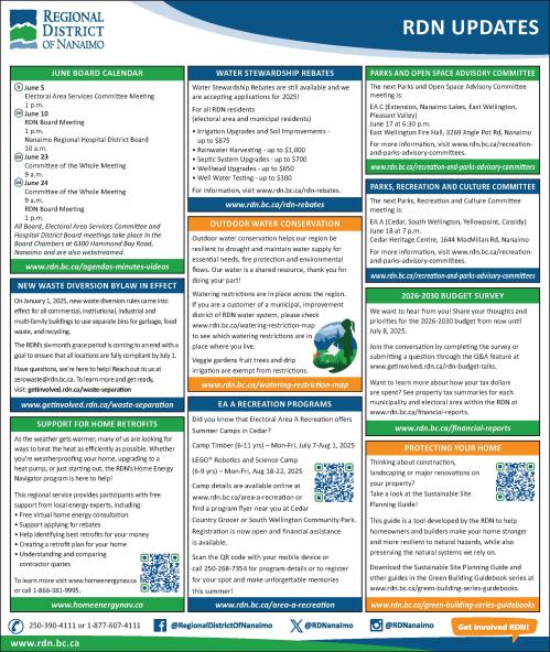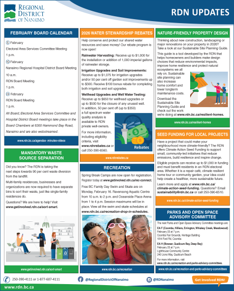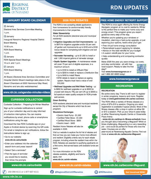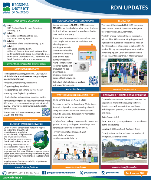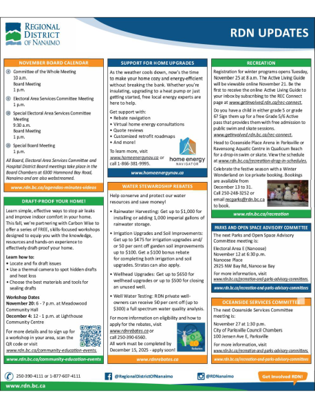 Keep up to date on various projects, initiatives, events and meetings being hosted by the RDN. Be sure to watch for our monthly RDN Updates in the Nanaimo News Bulletin, Gabriola Sounder and Parksville Qualicum Beach News on the first Wednesday of every month. Did you miss them or not get the newspaper? Click below for our recent monthly ads: