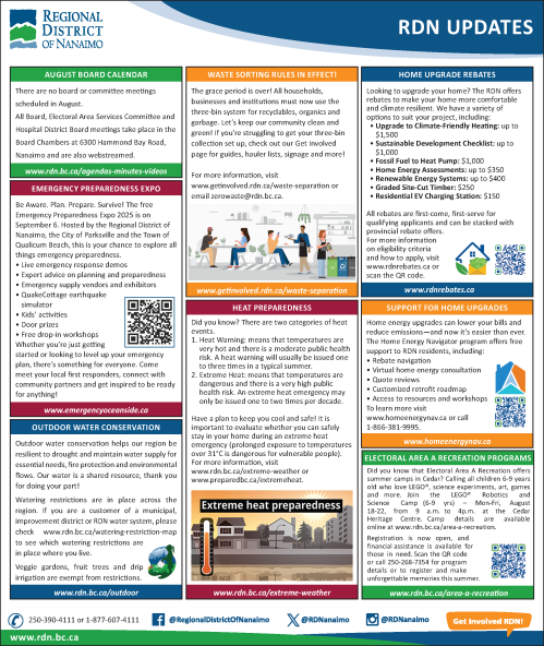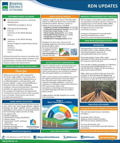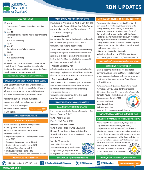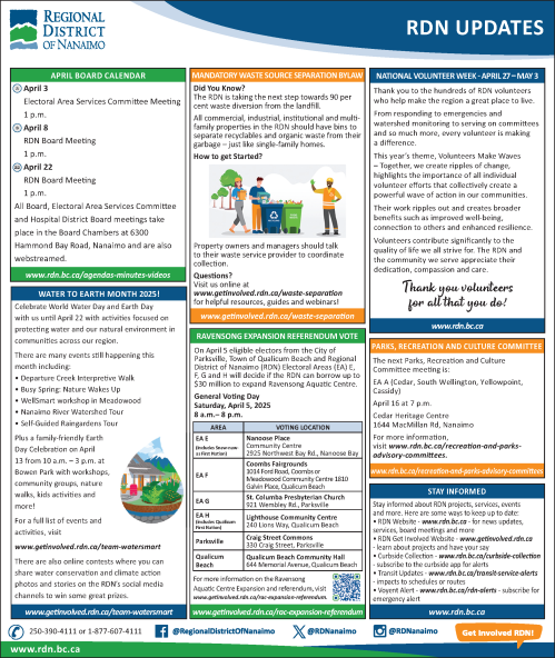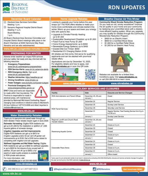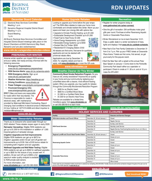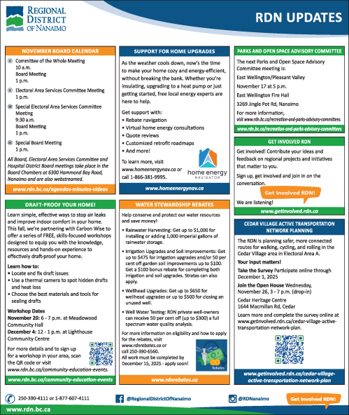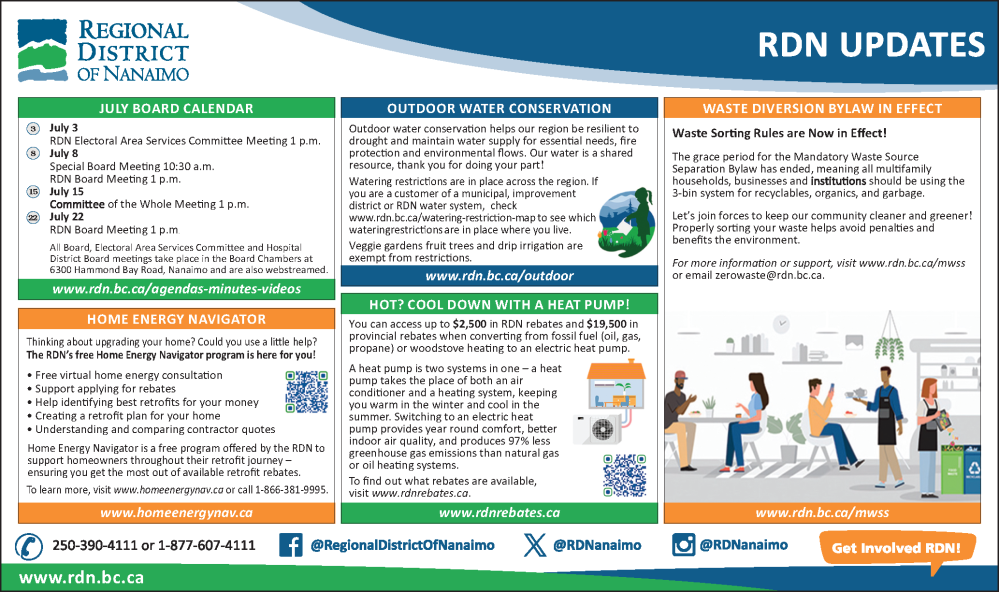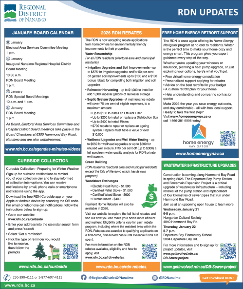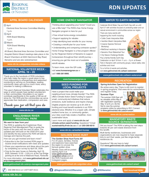 Keep up to date on various projects, initiatives, events and meetings being hosted by the RDN. Be sure to watch for our monthly RDN Updates in the Nanaimo News Bulletin, Gabriola Sounder and Parksville Qualicum Beach News on the first Wednesday of every month. Did you miss them or not get the newspaper? Click below for our recent monthly ads: